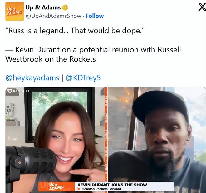 在凯-亚当斯的播客节目中,杜兰特称威斯布鲁克能否加盟火箭与自己“无关”。“我完全不清楚,也没向任何人打听过(重聚的事)。这件事根本没被提上议程,而且通常这类事要是有眉目,动静都会很大,”杜兰特说,“但除了网上球迷的讨论,我没听到任何相关消息。”