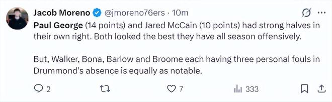 费城记者盛赞乔治半场14分、魔仙哥半场10分很出色,乔治半场8中6拿14分是目前半场得分新高。
